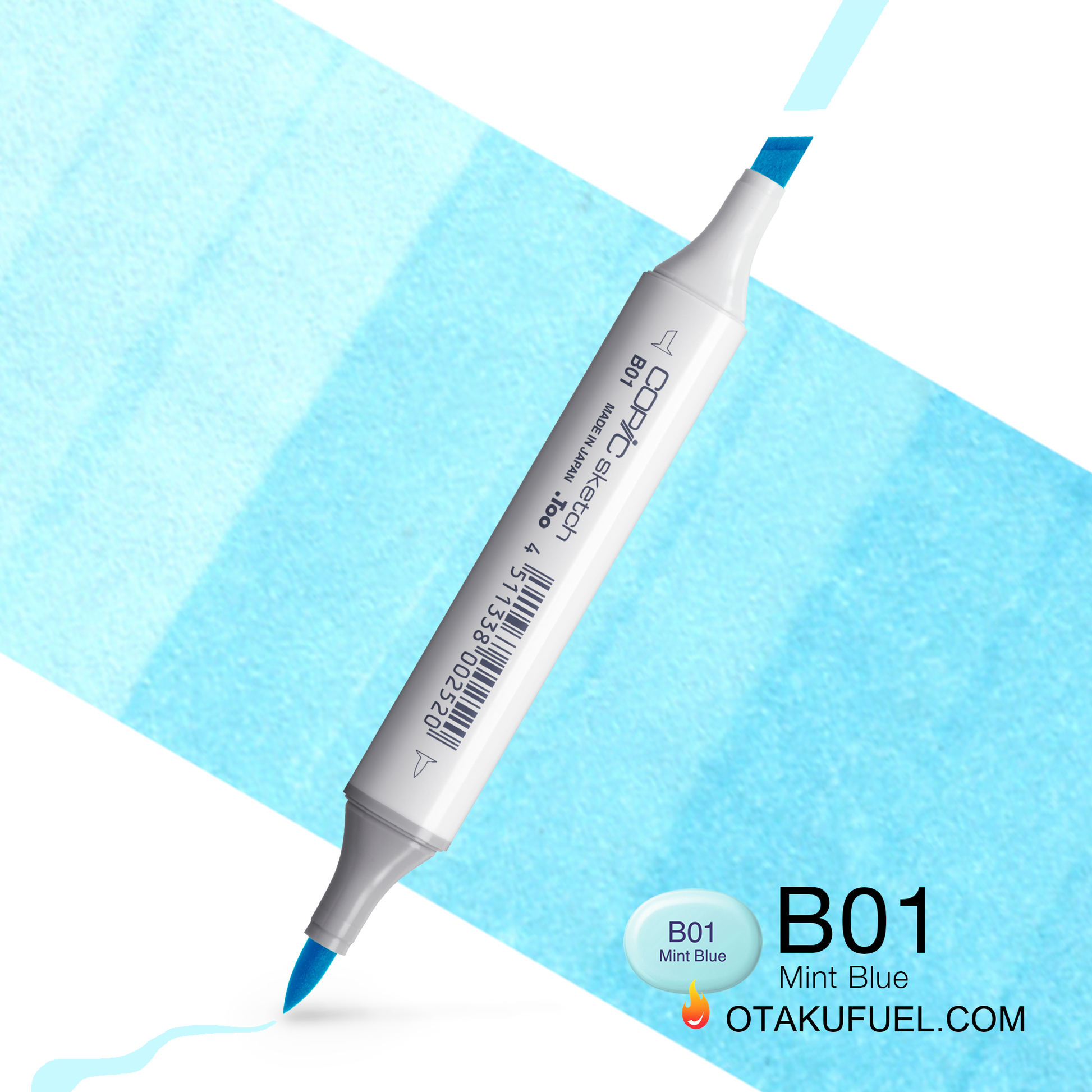 B01-S Copic Sketch B01 Mint Blue Marker Copic makes the highest quality alcohol markers in the world. Developed for and widely adopted by the Japanese manga industry, Copic markers are ideal for all styles of art, design, illustration, and crafts. Durable, refillable, and featuring replaceable nibs, you only need to buy a Copic marker once. Vibrant, Smooth Coloration Copic ink applies smoothly and is easy to blend. The alcohol based ink dries acid free and does not destroy paper fibers the way water based inks do. Also, the open time on uncoated papers is limitless, so you can go back and re-wet the ink years later! Permanent & Non-Toxic Copic markers are free of harmful chemicals and overwhelming odors, making them much more enjoyable to use than other brands. Refillable Once you purchase a marker, it is yours for life. By simply refilling the marker and replacing damaged nibs, your marker will last a lifetime. Some artists have been using the same markers for almost 25 years. Dependability Copic markers will not dry out when not in use. With a guaranteed 3-year shelf life, your investment will not waste away in storage. Quality Tested Each marker is hand-tested for overall quality and color consistency three times before it is shipped from Japan. Super Brush Nib This unique, flexible brush allows for smooth blends and paint-like application. No other brush marker on the market has the feel and quality of the Super Brush nib.