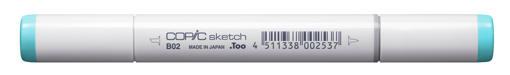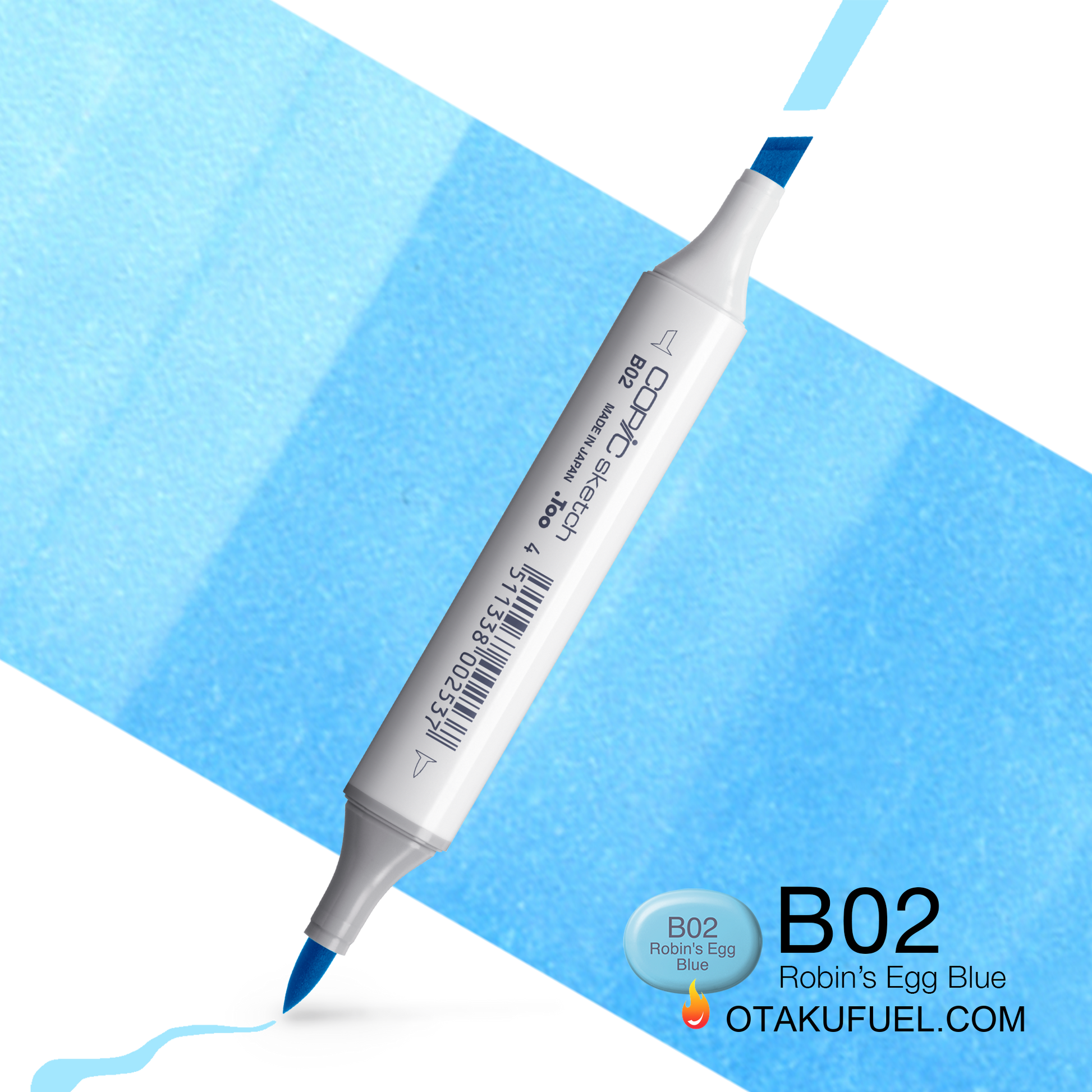 B02-S Copic Sketch B02 Robin's Egg Blue Marker Copic makes the highest quality alcohol markers in the world. Developed for and widely adopted by the Japanese manga industry, Copic markers are ideal for all styles of art, design, illustration, and crafts. Durable, refillable, and featuring replaceable nibs, you only need to buy a Copic marker once. Vibrant, Smooth Coloration Copic ink applies smoothly and is easy to blend. The alcohol based ink dries acid free and does not destroy paper fibers the way water based inks do. Also, the open time on uncoated papers is limitless, so you can go back and re-wet the ink years later! Permanent & Non-Toxic Copic markers are free of harmful chemicals and overwhelming odors, making them much more enjoyable to use than other brands. Refillable Once you purchase a marker, it is yours for life. By simply refilling the marker and replacing damaged nibs, your marker will last a lifetime. Some artists have been using the same markers for almost 25 years. Dependability Copic markers will not dry out when not in use. With a guaranteed 3-year shelf life, your investment will not waste away in storage. Quality Tested Each marker is hand-tested for overall quality and color consistency three times before it is shipped from Japan. Super Brush Nib This unique, flexible brush allows for smooth blends and paint-like application. No other brush marker on the market has the feel and quality of the Super Brush nib.