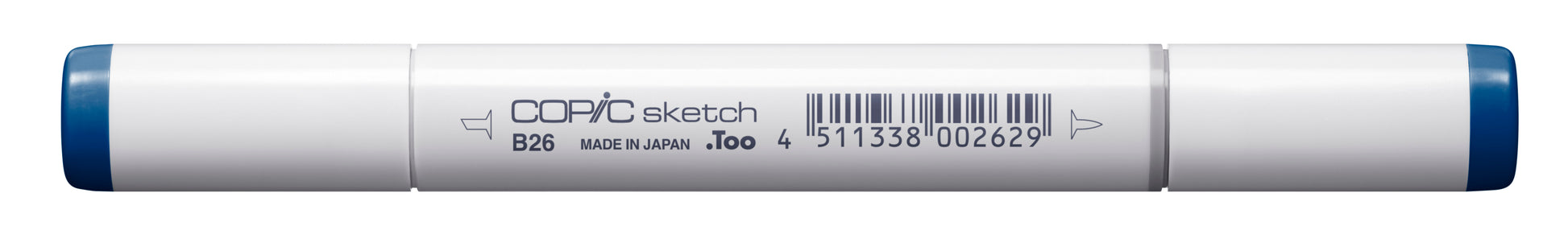 B26-S Copic Sketch B26 Cobalt Blue Marker Copic makes the highest quality alcohol markers in the world. Developed for and widely adopted by the Japanese manga industry, Copic markers are ideal for all styles of art, design, illustration, and crafts. Durable, refillable, and featuring replaceable nibs, you only need to buy a Copic marker once. Vibrant, Smooth Coloration Copic ink applies smoothly and is easy to blend. The alcohol based ink dries acid free and does not destroy paper fibers the way water based inks do. Also, the open time on uncoated papers is limitless, so you can go back and re-wet the ink years later! Permanent & Non-Toxic Copic markers are free of harmful chemicals and overwhelming odors, making them much more enjoyable to use than other brands. Refillable Once you purchase a marker, it is yours for life. By simply refilling the marker and replacing damaged nibs, your marker will last a lifetime. Some artists have been using the same markers for almost 25 years. Dependability Copic markers will not dry out when not in use. With a guaranteed 3-year shelf life, your investment will not waste away in storage. Quality Tested Each marker is hand-tested for overall quality and color consistency three times before it is shipped from Japan. Super Brush Nib This unique, flexible brush allows for smooth blends and paint-like application. No other brush marker on the market has the feel and quality of the Super Brush nib.