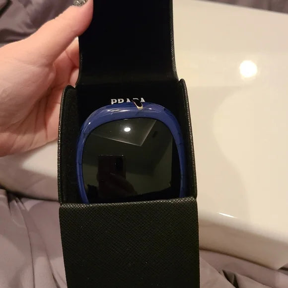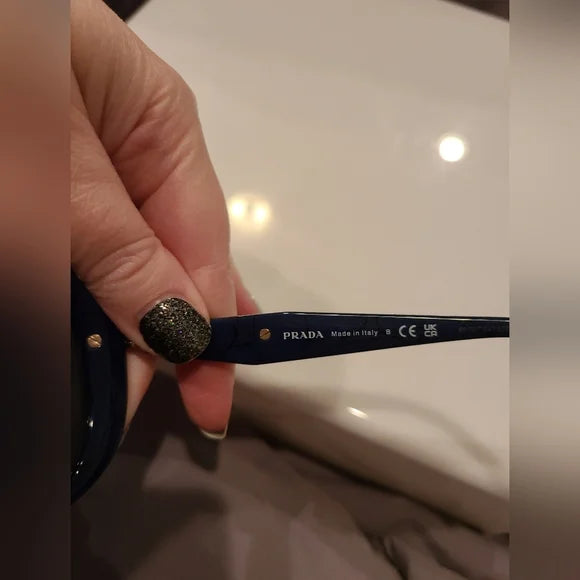 they have a dark blue marbled frame with dark gray lenses in the side arm is the Prada Milano
